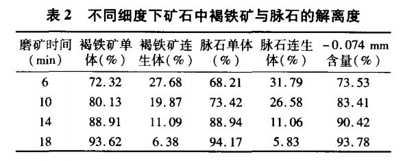 該礦的主要成分是褐鐵礦,也就是氧化鐵的水化合物。經(jīng)過比磁化系數(shù)測定,該礦的比磁化系數(shù)為53.2×10(-6)(cm.g-1),屬于弱磁性礦物。所以一般的弱磁和中磁選都比較難回收。根據(jù)原礦的組成,該礦的脈石解離度測定結(jié)果見表2。