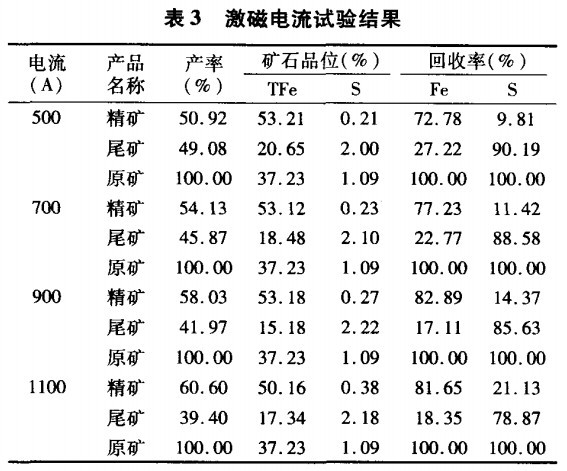 從表3結(jié)果可見,激磁電流從500A增加到900A時,精礦鐵品位和回收率都隨之增加,硫的品位降低。但當激磁電流達到900A以后,繼續(xù)增大激磁電流。鐵精礦回收率增加,但品位卻隨之下降,而且鐵精礦中硫的品位大于0.3%,所以綜合考慮,選礦試驗采用900A比較合適。