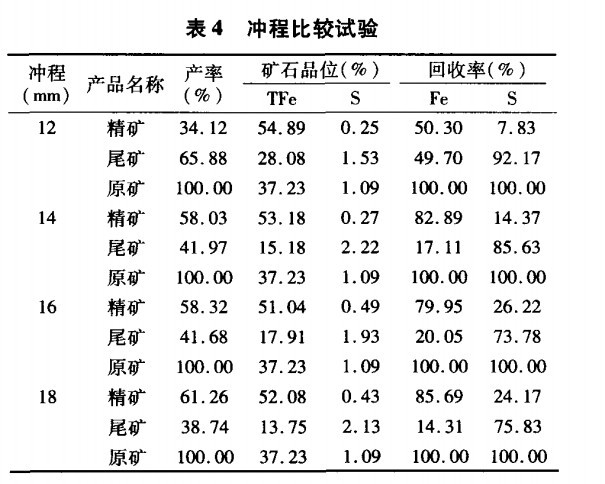 從表4可以看出,沖程在14mm指標較好。說明沖程在14mm的時候,各產(chǎn)品得到了較好的松散,在這種磁場作用下,精礦的產(chǎn)率達到58.03%,回收率達到了82.89%,*終硫在精礦里面的品位只有0.1%左右,達到了國標要求。