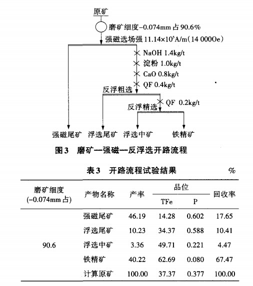 (3)原礦含磷0.377%,偏高,但磷礦物大多分布于石英中,選別過(guò)程中隨石英進(jìn)入尾礦,鐵精礦含磷降至0.085%,達(dá)到了國(guó)家標(biāo)準(zhǔn)。