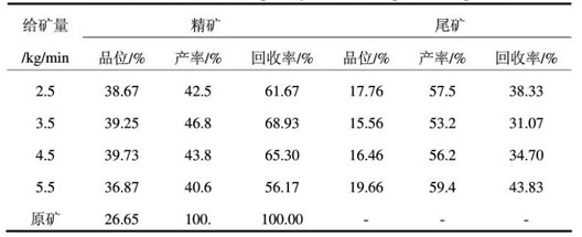 單位時間內(nèi)的給礦量對磁選設(shè)備分選效果的影響也較大。給礦量過大會使轉(zhuǎn)環(huán)的負荷較大,同時容易造成介質(zhì)堵塞,增加夾帶情況的發(fā)生和目的礦物的損失;給礦量過小又會使處理量減小,分選系統(tǒng)的使用不能完全發(fā)揮出來,造成效率低下,因此通過試驗找到適當?shù)慕o礦量也是非常有必要的。